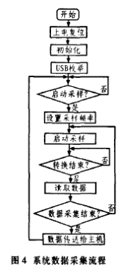 Microsoft公司未提供适合于本系统USB接口的驱动程序,因此需自行开发。该程序的功能是:当USB设备连接到主机上时,主机可以发现新设备,然后建立连接并完成数据传输任务,也就是能够让Windows正常检测和识别USB设备。采用Driver-Studio中的DriverWorks作为开发工具,开发WDM型的USB驱动程序。图4为系统数据采集流程。