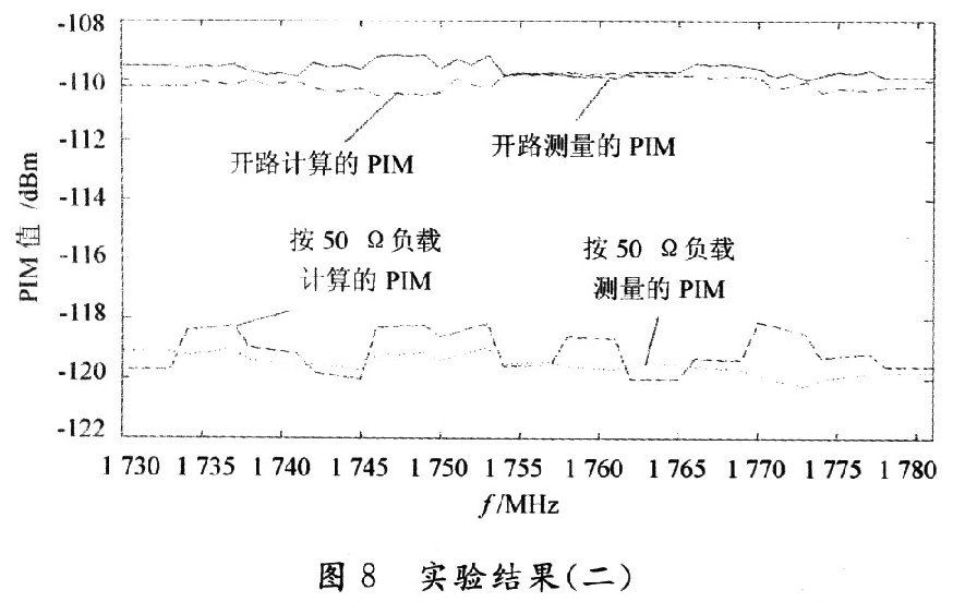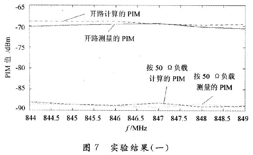 由以上的分析可知,这种计算方法计算出来的PIM值和真实的PIM值十分接近,并且随频率的变化趋势一致。同时可以看出,在开路的时候所测量的PIM明显要比接负载的时候所测量的PIM要大,增大的PIM值是因为匹配不好所造成,当然,相同的负载状况在不同的频率下呈现的匹配状态是不一样的。