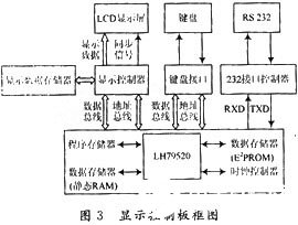 显示与键盘控制系统由CPU、显示、键盘、RS 232接口及数据交换组成。其中CPU为LH79520,为了满足储存部分数据的需要而使用了32 kB的E2PROM作为数据存储器来存储部分测试结果。显示部分采用了OKI公司的MSM6255作为显示控制器,外接32 kB的RAM作为显示数据的存储器,MSM6255产生的行同步信号、场同步信号、显示数据被送往EL显示屏。键盘部分用8279作键盘控制器。为实现外接计算机对仪器的控制,系统中使用厂MAX202作为接口电平转换控制,以RS 232接口与外部连缓。