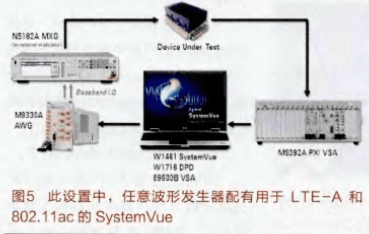 此设置中,任意波形发生器配有用于 LTE-A 和 802.11ac 的 SystemVue,可以提供测试元件所需的标准信号,运行安捷伦矢量信号分析(VSA)软件的 M9392A 捕获信号,以测量功率放大器的非线性。使用 SystemVue 以及 M9330A 和 M9392A 可以控制并实现整个数字预失真设计流程的自动化。
