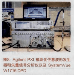 图8显示的是5步测量法数字预失真建模流程在商用功率放大器中的应用。与图5的示意图一致,运行 SystemVue 的笔记本电脑(图 8 上部)控制安捷伦 PXI 模块化仪器(图 8 下部),M9330A 任意波形发生器与 M9392A 集成于同一个机箱。外部 N5182 MXG 射频信号源(图 8 中部)将 M9330A 任意波形发生器输出的基带信号上变频为调制载波。