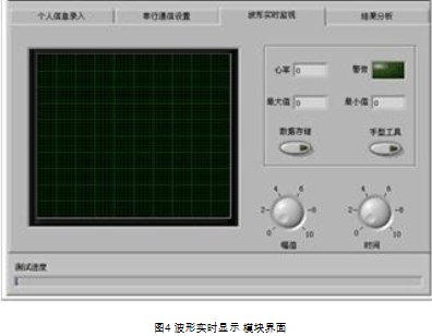 通过串口接收到的数据,对调幅波进行同步解调,为尽可能不失真的还原波形,采用最大平坦型巴特沃斯滤波器进行滤波处理,利用峰值检测、微分处理等方法提取波形特征信息,通过波形实时显示模块进行显示,模块界面如图4,此模块中还可以显示心率,并且当心率不在正常范围时报警提示,可以选择将该波形数据存储,进行后续处理分析。在人体情绪上有波动或肢体上的微小动作会对信号产生较大影响,需要待被测试者进入身心平静状态后测量才比较准确。