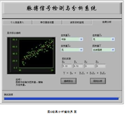 回归分析是处理变量之间相关关系的数学工具,它可以帮助人们从一组实验数据出发,分析变量间存在什么样的关系,进而建立这些变量间的回归方程。系统应用的最终目的是进行人体试验,采集数据到一定数量时,在结果分析模块内(如图6),可选择自变量、因变量(主波强度、重搏波强度、主波与重搏波强度比、上升沿斜率)以及自变量的个数。本设计中首先读入测试数据,通过数学库中“删除超出区间数”工具剔除异常数据,根据需要配置 “曲线拟合”面板,即可对拟合曲线进行显示,并给出回归系数,建立回归方程。通过积累一定量数据之后,总结各种因素对脉搏信号影响规律,研究正常人与高血压患者之间的波形差异,以及不同程度病情的高血压患者波形演变规律。