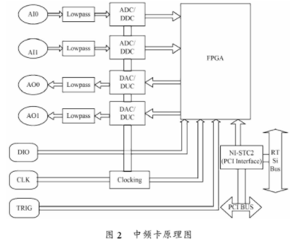 PCl-5640R数据收发中频卡主要由PCI总线接口、FPGA、数字上变频芯片AD9857、数字下变频芯片AD6*、存储器以及触发电路组成。FPGA型号为Xilinx Virtex-5 SX95T,有640个乘法器,它不需要通过Maxplus Ⅱ编程,而直接用LabVIEW编程再编译即可;AD9857有两路14 的高性能DAC,内部时钟达200 MHz,内置数字上变频器,单端输出, 阻抗50Ω;AD6*有两路l4位高性能ADC,内部时钟达100 MHz,内置数字下变频器,单端输人,阻抗50Ω。