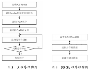 主程序的设计思路是:首先启动 PCl-5640R板卡,然后调用仿真数据进行转换,再将数据送入FPGA程序中处理,并不间断地从FPGA读取数据,以监控是否有溢出,最后判断是否有错误,若有则中断程序,如无则继续监控是否有溢出和有无错误,程序如图5所示。