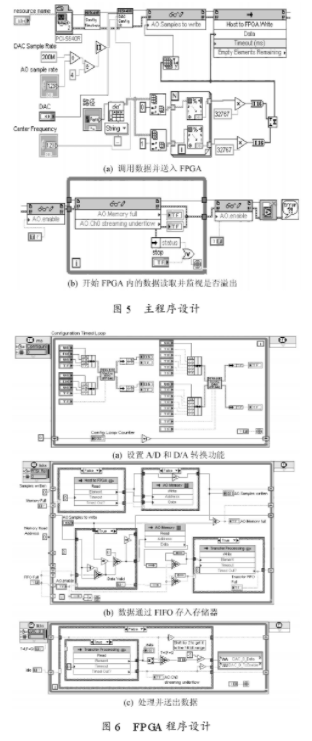 图6(a)中的Nl5640R Config ADC和NI5640R Config DAC是用于在FPGA芯片上设置A/D和D/A转换功能的程序模块,这两个模块是PCl-5640R特有的,只需对其参数遴行配置即可。图6(b)中数据是通过FIFO送入Memory中,再通过计算Memory 的地址,寻址读取数据,再送到Transfer Processing这个FIFO中。图6(c)是将数据从这个FIFO中读取,再转换成 14位数送入AO0口。