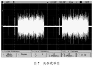 将以上数据叠加,得到混合波形数据。将混合波形数据通过 LabVIEW程序送到PCl-5610R中频卡。输出的波形如图7所示。