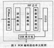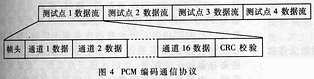 PCM编码通信协议如图4所示。译码模块分别提取信息码流中的位同步和帧同步信号,并将PCM码译成NRZ码。分路模块接收译码模块输出的位同步时钟、帧同步信号和串行NRZ码流,将串行信号分路,输出宽度为16位的并行信号。数据重排模块接收来自三个分路模块的并行信号,将它们按一定的规律送入缓存并发出中断申请。USB单片机接收到中断后,从缓存中取出数据并通过USB总线传送给计算机。