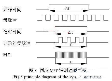 根据计时方案的不同,目前数字式转速测量装置的计时方法主要有M法、T法和同步M/T法。M法测速是在相等的时间间隔△t内读取脉冲数M,由M/△t计算出转速,速度越高在△t时间内计得的M就越多,由±1个计数脉冲误差所引起的转速测量误差就越小,故该法适用于高速。T法测速是根据相邻两个脉冲时间间隔对应的时钟脉冲计数值m来计算转速的,转速越慢或每转脉冲数越多,其计数值m就越多,计数器±l个计数脉冲所引起的误差就越小,故该法适用于低速。上述两种方法测量的绝对误差反比于速度采样时间T(Hp:时间间隔△t或计数值m),因此在稳态测量和实时性要求不高的场合,可取较大的T以保证足够的测量精度。但在动态测量和实时控制系统中,往往对转速测量的实时性有较高的要求。因此,采样时间T不能随意取大,为了解决既要周期小,又要测速精度高的矛盾,可采用同步M/T法。这种方法的特点是不固定定时时间△t′,以记录到完整的盘脉冲为准,主要是设法使M与△t′同步,从整数个盘脉冲开始计时,同样在整数个盘脉冲结束计时,记录到的是整数个盘脉冲,且与计时是“同步”的。其原理如图3所示,在采样时间△t时间内实际计时时间△t′开始于第一盘脉冲的下降沿,终止于最后一个脉冲的下降沿,因而得到整数个盘脉冲,消除了M法和T法中±1个脉冲引入的误差。鉴于几种方法的比较,在设计中采用同步M/T法设计本测速系统。