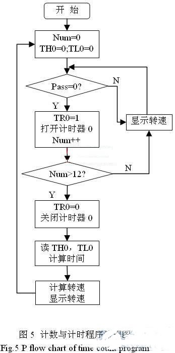 由图2可知当红外线发射管发射的红外线未被轮齿挡住时,接收管受红外线照射呈导通状态,经反相器输入到单片机中断端口的电压为高电平,不产生中断;而当红外线发射管发射的红外线被轮齿挡住时,接收管不受红外线照射则呈截止状态,经反相器输入到单片机中断端口的电压跳变为低电平。从而激活中断程序对脉冲进行计数。计数流程图如图5所示。由于计数需要与计时同步,所以需要在产生第一次红外光被挡住时(红外光被挡住时Pass=0,反之Pass=1),也即中断口电位由高变低时打开定时器。由于实验中的齿盘共有108个齿,为了提高测量的实时性,把108个齿分成9等份,当计数值(Num)为12时关闭定时器并读取定时器的计时值。