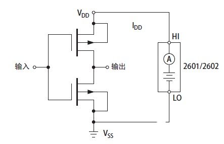此测试涉及在输入端处于VDD或VSS并且输出端未连接时,测量CMOS IC的VDD电源耗电流。图1是一个CMOS反相器的测试设置框图。在这个例子中,2601/2602用于源电压(VDD)并测量产生的静态电流。