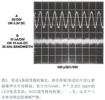 关键是要从LED偏移中消除与振荡器相关的信号分量,以维持低的失真。任何这类残留成分都会调制振荡器的波幅,从而引入不纯净的频率分量。带宽限制的AGC信号路径有很好的滤波。