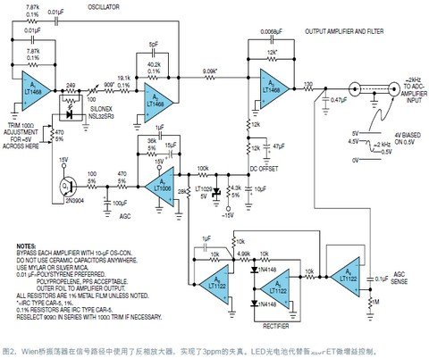 设计源于Winfield Hill的一项工作,他是哈佛大学罗兰学院电子工程实验室的主任。以后可以将此设计用于2kHz的Wien桥设计(图2)。所有放大器都以反相方式使用,这样可以消除信号路径中的CMRR(共模抑制比)误差。