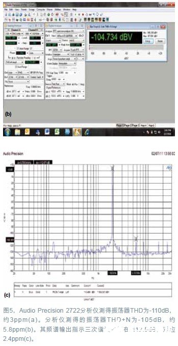 要对振荡器失真做有意义的测量,就需要使用低不确定性本底的专用分析仪。Audio Precision公司的2722分析仪有最大2.5ppm的THD+N (总谐波失真+噪声),典型THD+N为1.5ppm。该仪器对振荡器的THD做了三次测量,得出的THD值为:在3ppm、5.8ppm和2.4ppm时分别为 -110dB、-105dB和-112dB(图5)。这些测量结果为将该振荡器用于确定ADC保真度特性提供了信心。