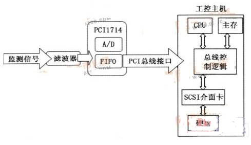 将需监测的现场信号经滤波器滤波后送入PCI-1714 板卡, 卡上A / D 转换器对信号进行高速模数转换。转换数据首先暂存在板卡的32 K 板载FIFO (先入先出) 中, 当FIFO 半满或全满时,向DMA(动态内存存取)控制器发送DMA 请求,使用直接内存存取方式,经PCI(外设组件互连)总线将数据从FIFO 输出到内部缓冲区中,PCI 总线传输带宽很宽, 可以满足4 通道高速同步采样时所带来的高速数据传输要求。