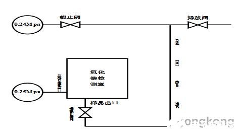 AT-10采用系统不同位置之间的压差来确保正常进样气体的流动,AT-11则使用氮气作为动力驱动样品气流动。(分析仪表取样预处理)AT-10其取样进口紧靠工艺管线,取样压力为0.25Mpa,返回出口设置在工艺压力为0.24Mpa的位置,利用其0.01的压差使得样品气在管线中循环流动。样品的返回管线一般较长,可达10米左右。其样品循环管线图如图: