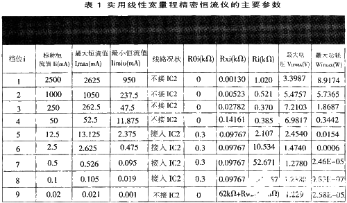 该恒流仪共有9档,恒流输出范围为1μA~2.5×106μA,跨越了6个数量级。第1~8档为线性输出档,第9档为非线性输出档。各档输出的电流以及各元件的参数见表1: