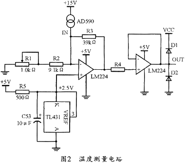 考虑到AD590温度传感器的输出电流源特性,设计的温度信号测量电路如图2所示。该电路的温度测量范围为-10~+500℃。AD590采用15V电压供电;电阻R1用于调整零点;电阻R3为精密电阻,用来调整增益。运放的同向端输入2.50V精密参考电压,该电压由TL431提供。IN端输入AD590的电流,OUT端输出为相应转换所得到的电压。根据AD590的特性,在-10℃时,流过电流为262.2μA,设计使这部分电流全部流过R1、R2,而其后增加的电流均流过R3,OUT端的输出电压为: