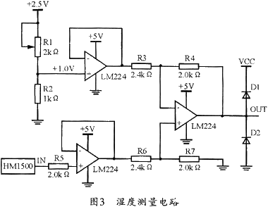 集成湿度传感器HM1500的输出电压在1~4 V间随湿度线性变化,考虑到本系统的单电源特点,设计的湿度信号采集电路如图3所示,该电路的测湿范围为0~100%。