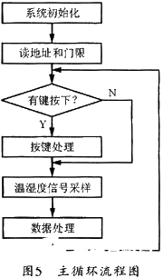 图5为该系统的主循环流程。系统上电以后,首先读取存在EEPROM中的地址和温湿度门限值,然后进入循环状态进行温湿度信号采样,接着对采集得到的数据进行处理并存储,同时在循环中对按键标志位进行判断。如果被置位,则执行相应的按键处理。