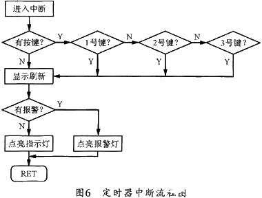 图6为该系统的定时器中断流程。当系统进入中断以后,首先通过判断相应的IO口输入电平是否跳低来判断是否有键按下,如果有键按下,则进一步判断是哪一个键,接着存储该键位并将按键标志位置位。之后再调用显示刷新程序,将最新采集到的数据送到数码管显示。最后判断采集到的数据是否超出门限,并相应点亮指示灯或者报警灯。执行完以上操作后中断返回。