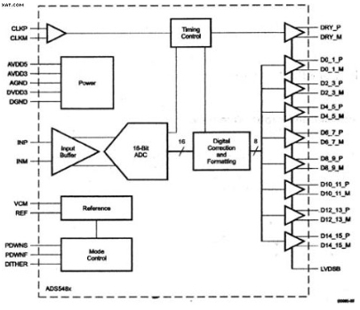 ADS548X系列ADC芯片的结构框图如图3所示,从图中可见,输入信号INP、INM经过缓冲输入级放大后,由16位ADC模/数转换器的取样时钟作时分取样。再经数字修正和整形,样本值送入8组低压差分放大,由数据线D0、D2和D14输出至后级存储器。