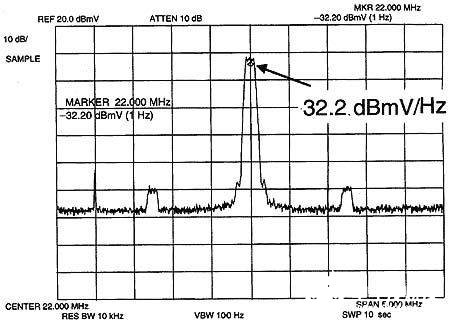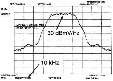 当使用某些特定的频谱仪时,有件事要注意。被测信号一定要填充(跨越)显示屏的几个格子,即信道带宽尽可能接近频谱仪扫描带宽。这是由于噪声光标所显示的值实际上是1~2个格子中所有噪声的平均值。图4表示了不正确的测量情况,其被测信号与图3是相同的,但是其扫描带宽增加了,结果信号显得很窄,连一个格子也没有充满,此时的噪声光标读出的是 -32.2dBmV/Hz,而不是-30dBmV/Hz,这是因为它把信道旁边的真正噪声功率也一起平均,而那里不含有任何信号功率。如果仔细看这张图,你会发现光标的上下位置实际上比信号所显示的曲线要低一些。