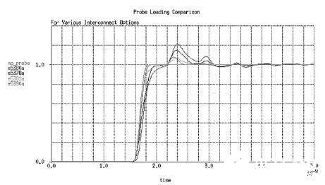 图2. 波形是比较各种互连探头负载的好方法。负载随连接器尺寸的减小(或消除)而减小。系统的原上升时间是150ps。