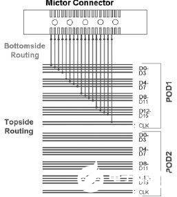 图6. 该连接方案用基于Mictor 连接器的探头观察总线信号。注意连接Mictor 需要另外增加走线长度。这就把走线电容 (3pF) 加到了连接器上。这一连接的净电容已大于3.5pF,从而造成系统故障。