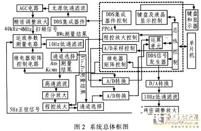 根据以上方案论证,系统总体框图如罔2所示。系统主要由信号发生、参数测试、测试电路控制和人机交互等模块组成,单片机和FPGA共同控制模块。5 Hz信号由FPGA内部DDS产生,扫频信号由AD9851产生;测量电路的输出结果经后级滤波、放大处理后由A/D转换器采样送至FPGA进行运算;单片机和FPGA通过继电器选择以测量电路和测量量程;FPGA提供键盘和显示器以实现人机交互;测量结果存储在RAM中,并能通过微型打印机打印出来。