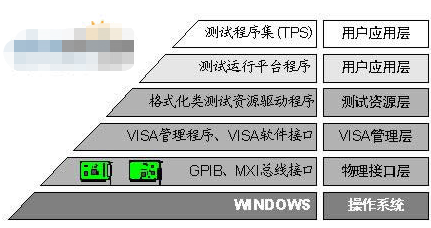 测试软件由格式化类测试资源驱动程序、测试运行平台程序、测试程序集等组成。格式化类测试资源驱动程序是一组面向各仪器类(数字多用表、开关类、电源类等),封装了测试资源的VISA驱动功能,提高测试资源可互换性。测试运行平台程序主要完成测试资源配置、初始化、测试程序运行支持、故障诊断、测试和故障诊断数据的存储、浏览与打印等一系列工作;测试程序主要完成对所有被测设备的控制、测试资源控制、测试结果数据的处理与显示以及整个测试过程的控制与管理等,软件层次结构如图3所示[3]。