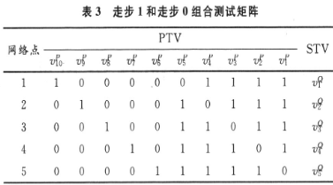 设网络总数为N,走步1算法的初始测试矢量为1,O,0,…,O(N维),然后让1顺序移位,构成N行N列的测试矩阵,所以称作走步1算法。走步O算法与走步1算法原理相同,只是走步O算法的初始测试矢量为O,1,1,…,1,然后让O顺序移位。走步1算法和走步0算法生成的测试矩阵,PTV数量都是N。
