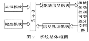 根据题目要求和本系统的设计思想,系统主要包括激励信号模块,机械传动模块,信号处理模块,显示模块和键盘模块,系统总体框图如图2所示。