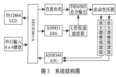 本系统主要由DDS模块、宽带低失真全差分放大模块,线性可变差动变压器的能量耦合模块、放大整流滤波模块以及4×4键盘和128×64LCD模块构成的人机界面组成。系统结构框图如图3所示: