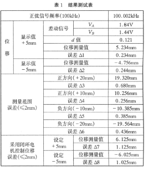 将硬件模块和相应的软件进行系统整机测试。依据设计要求,分别对输出频率、输出电压峰峰值、磁棒上下移动的最大和最小位移进行测试。