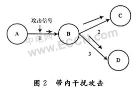 带内干扰攻击是注入一个光信号专门来降低接收机正确解译数据的能力,它不但破坏攻击源所在链路上的信号,而且也影响与该链路节点相连的其他链路上的信号质量,如图2所示。这是信号不需再生而直接在链路中传播造成的。