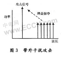 带外干扰攻击是利用器件的泄漏或交叉调制效应降低信号能量,攻击者注入一个与通信波段不同波长但又在放大器放大带宽内的信号,攻击信号就会掠夺其他信号的增益,如图3所示。