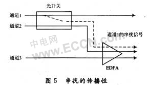 攻击点6——光开关 若光开关行性能不理想,会导致串扰,且具有传播性,一阶串扰引起二阶串扰,再引起三阶串扰等,如图5所示。合法用户间也可能存在串扰,可怕的是,一旦攻击者发送恶意攻击信号,将产生严重的带内干扰,同时也能通过串扰窃听。