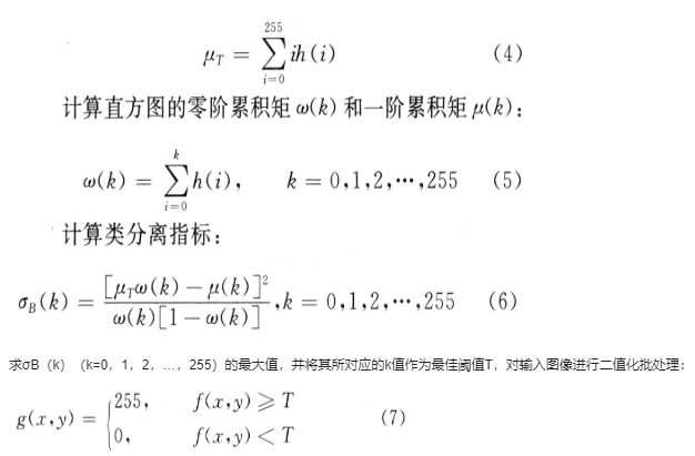 OTSU最大类间方差法是在最小二乘法原理的基础上推导得出的。它通过利用直方图零阶、一阶累积矩来最大化判别函数,选择最佳阈值。设输入图像为f(x,y),二值化后的图像为g(x,y),阈值为T,那么图像二值化过程如下: