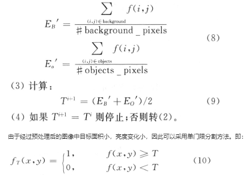 (2)在第t步,分别计算背景和目标的灰度均值EB’和Eo’,其中在第t步将图像分割为背景和目标的阈值是T’,它是在前一步确定的。