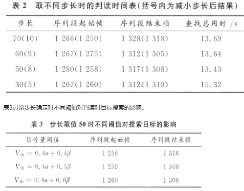 由实际处理结果可见,步长太大,帧间跨度大,会影响搜索精度,太小则搜索时间长;而信号量阈值的权值系数越大时,有用目标段序列越短,越小则有用目标段序列越长。为保证有用目标段序列检测的速度和精度,一般情况下步长设置在设定的目标数中间段,信号量阈值设得稍微低一些,再利用多帧积累求平均噪声,使每幅图像的噪声更接近统计噪声,减少由于噪声的突变导致起始帧或者结束帧的误判。