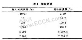 通过实验证明,该测量系统能测量出时间间隔范围为3.5 ns~7.2μs,分辨率能达到500 ps。测量误差在2%左右,其中时间间隔越短,误差越大。部分实验结果如表1所示。