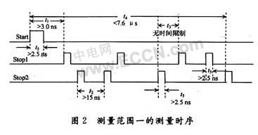 GP1据供了两个测量通道;每个通道的分辨率是250 ps,它基本的测量范围是15位。两个通道具有完全相同的分辨率,共用一个START信号和至多四个独立的STOP输入信号进行比较,最小时限为15 ns。START和STOP信号必须持续2.5 ns以上,否则芯片无法辨识。STOP信号之间可进行相互的比较,无最小时限。量程为3 ns~7.6μs,两个通道可进行排序,这样可使1通道允许8个脉冲输入,但通道2的STOP输入被忽略。测量时序如图2所示。