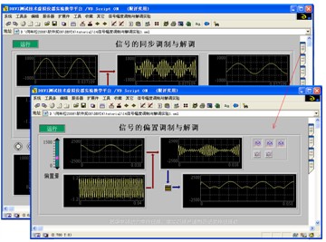 图4是信号调制解调知识点的虚拟仪器复合文档的显示情况。实验时可以用页帧在信号同步调制与解调实验、偏置电压的影响实验和载波频率的影响实验中进行快速跳转。