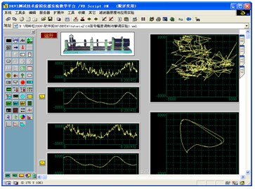 为了理论联系实际和开阔学生的学术眼界,我们还发挥课程组成员承担过大量科研项目的优势,从承担的科研项目中抽象出桥梁固有频率测量、齿轮箱振动故障源分析、汽车发动机加速过程噪声分析等16个工程测量案例,并设计成虚拟仪器仿真模块,集成在虚拟仪器实验教学平台中。图8是转子实验台模型和用其设计的轴心轨迹测量实验。