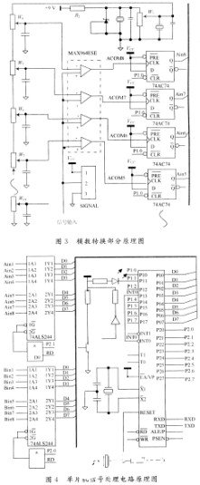 (2)数据处理部分,经A/D转换后的数字信号送入数据锁存器锁存,单片机通过缓冲器读取锁存器的数据,并将数据编码。