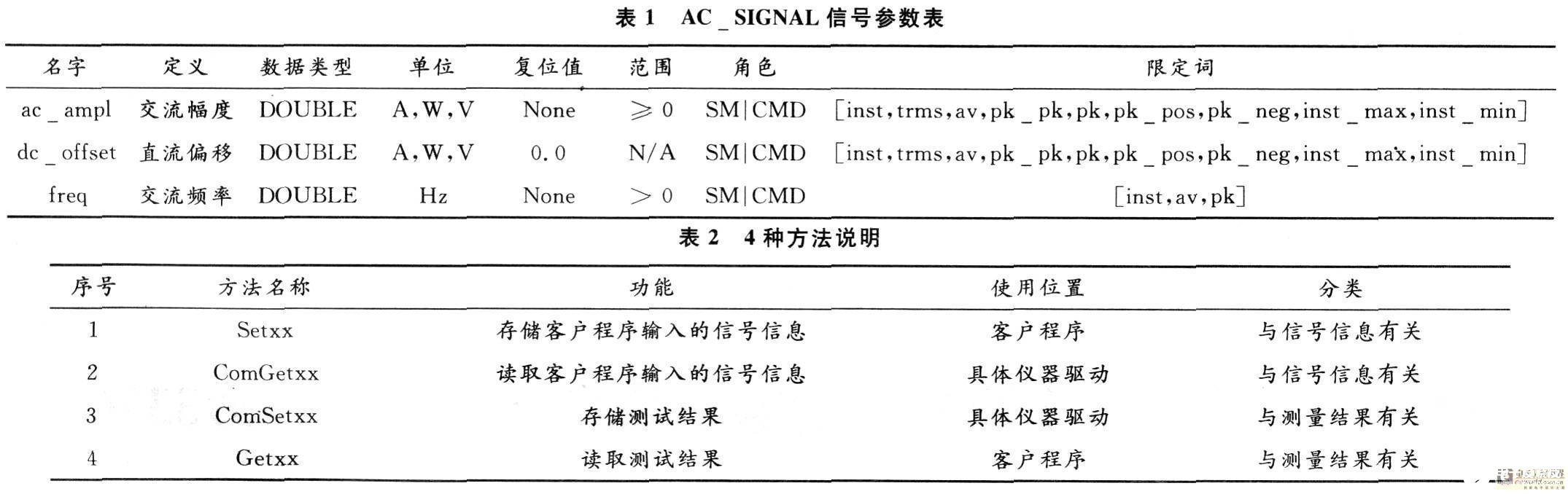 信号组件的本质是COM组件,该类型组件的主要功能在于存储信号参数信息,测试程序将所需信号信息传递给信号组件,数据将被暂存在缓存中,当程序调用具体仪器驱动时这些信号参数将被具体仪器驱动所读取,仪器动作到相应的状态。每个信号组件对应一种信号,该组件为客户程序提供了信号信息的公共存储区,同时测试返回的结果也在该组件下存储。下面以ACVolt信号组件为例,描述信号组件的原理。对于ACVolt信号来说,其信号参数包括Ac ampl,Freq,Dc_offset三种,信号组件中每个信号参数分别对应4组方法,这些方法是:Setxx,ComGetxx,ComSetxx,Getxx,方法的功能见表2。客户程序和具体仪器驱动之间通过资源分配器交互,双方的数据不能直接传递,因此信号组件成为两者数据交互的桥梁。