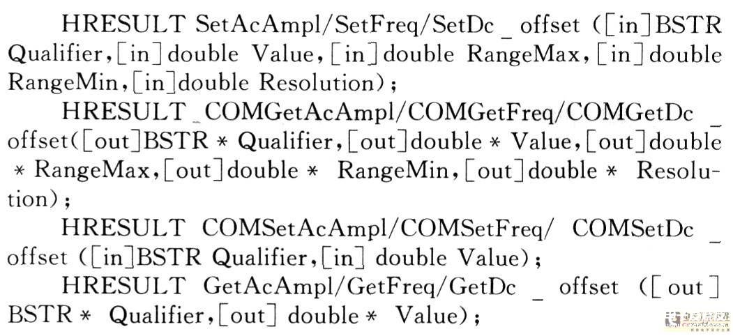 面向信号自动测试系统信号组件采用LabWin—dows/CVI 8.0作为开发环境,通过创建ActiveX服务器来完成信号组件的开发。现以ACVolt信号为例进行说明。首先创建ActiveX服务器。启动CVI8.0,创建新工程,命名为“AtpACVoltParam”;选择菜单栏“tools”-“create ActiveX server”项,CVI向导会自动弹出,将服务器名称命名为“AtpACVoltParam”,COM组件生成方式为动态链接库形式“dll”,其他设置不变。然后添加接口和接口方法。对于ACVolt信号来说其接口为“IAtpACVoltParam”,它的3个参数分别是幅值(Ampl)、频率(Freq)、直流偏移量(Dc off—set),接口方法和接口参数如下: