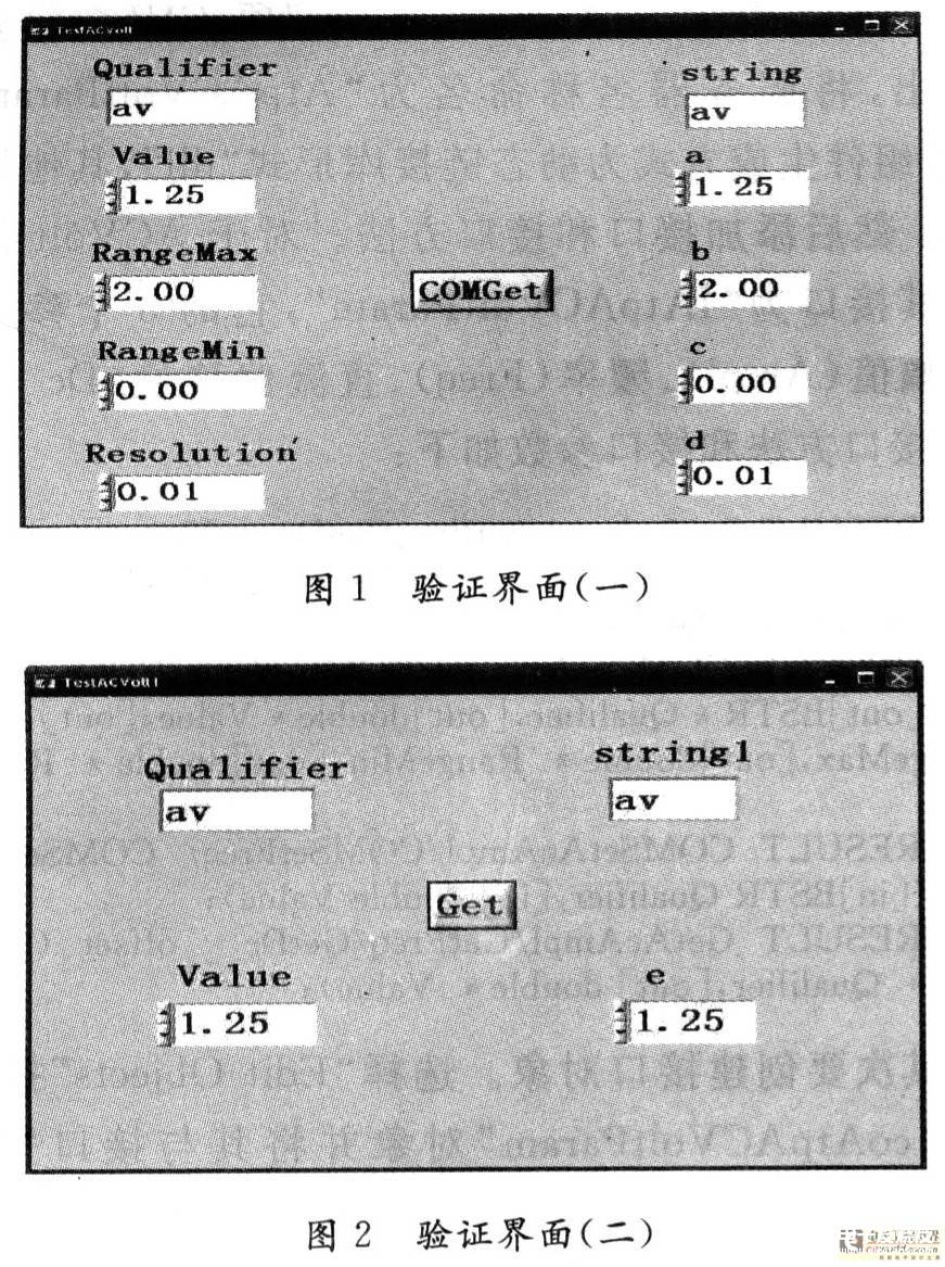 采用Labwindows/cVI 8.0作为开发环境,通过SetAcAmpl函数存储客户程序输入的幅值信息,然后用COMGetAcAmpl函数读取客户程序输入的幅值信息,验证界面如图1所示。这两个函数完成了存储信号参数信息的功能。通过COMSetAcAmpl函数存储测试结果,最后用GetAcAmpl函数读取测试结果,验证界面如图2所示。通过以上验证说明ACVolt信号组件可以实现对信号信息的存储,为下一步面向信号自动测试系统的实现提供参考。