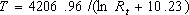 上式中 B、C 为常数。实验测得不同温度下热敏电阻阻值,把 lnRT 和绝对温度 T 进行线性拟合,得 B=4206.96 C=-10.23 。由式(8)得绝对温度与热敏电阻阻值的关系为: